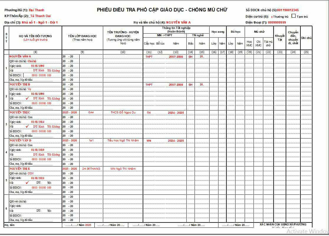 Thực hiện KH số 398/KH-SGDĐT ngày 13/2/2025 của Sở GDĐT về công tác PCGD mầm non cho trẻ 5 tuổi, phổ cập GD tiểu học, phổ cập GD trung học cơ sở và xóa mù chữ năm 2025; UBND xã Đại Thanh đã ban hành Quyết định số 940/QĐ-UBND ngày 08/9/2025 của UBND xã về việc thành lập Ban Chỉ đạo PCGD-XMC xã Đại Thanh và Kế hoạch số 114/KH-UBND ngày 09/9/2025 của UBND xã về công tác PCGD mầm non cho trẻ 5 tuổi, PCGD tiểu học, PCGD trung học cơ sở và xóa mù chữ năm 2025. Theo các văn bản chỉ đạo đó, phiếu điều tra phổ cập giáo dục cũng được thống nhất trong các tổ điều tra để thuận tiện cho công tác thu thập số liệu theo quy định. Nội dung này là nhiệm vụ quan trọng và cũng đã được truyền thông tới toàn thể nhân dân xã Đại Thanh trên các phương tiện thông tin.