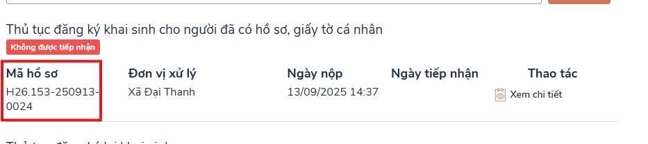 Lần 1, bà nộp ngày 12/09/2025 theo hình thức trực tuyến với thủ tục “Đăng ký lại khai sinh” có mã hồ sơ là H26.153-250912-0034 và không được chuyên viên Hoàng Văn Thắng tiếp nhận với lý do “Thiếu hồ sơ kèm theo”
